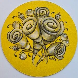 De ronde handgemaakte tile vraagt om iets anders. Geen hoeken, geen rechte lijnen. Gewoon een cirkel en jouw pen. Die vorm nodigt bijna vanzelf uit tot weelderige, organische composities. Perfect voor ZIA, Zentangle Inspired Art, waarbij kleur en artistieke vrijheid centraal staan. Meer over het verschil tussen Zentangle en ZIA lees je in mijn blog over de Zentangle methode.
