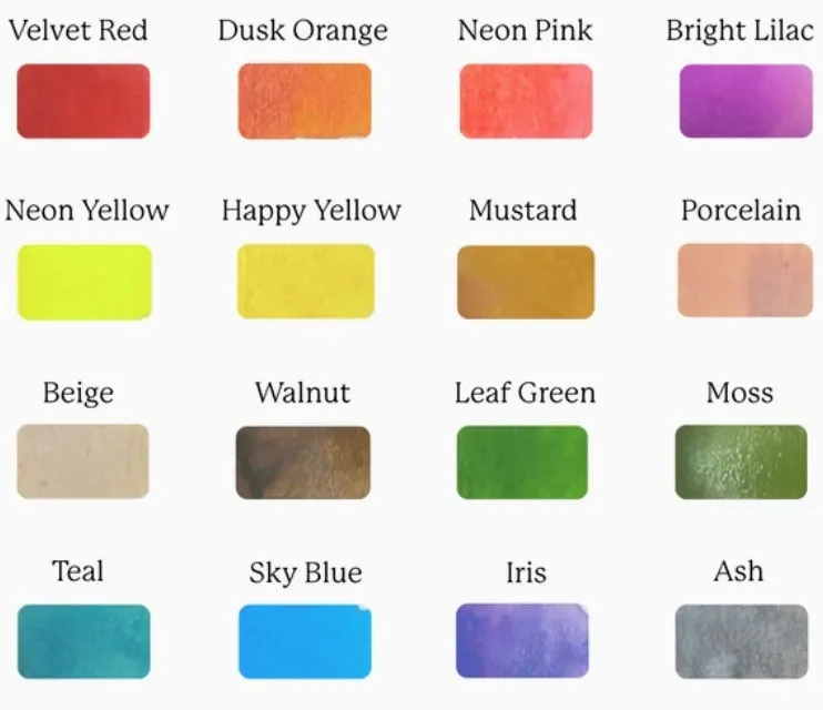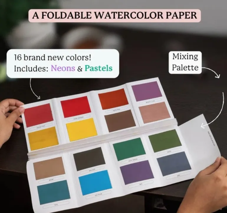 Dankzij het ingebouwde, herbruikbare mengpalet en het plasticvrije ontwerp is deze set niet alleen handig voor onderweg, maar óók vriendelijk voor de planeet. Dat maakt het extra leuk om ermee aan de slag te gaan. Denk aan zachte pastels, speelse neonkleuren en diepe, rijke tinten – allemaal netjes uitgevouwen in één overzichtelijk palet. Geen gedoe, geen geknoei. Gewoon openvouwen en beginnen.